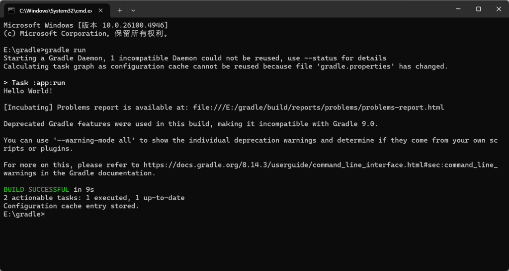 这个配好了后,我们可以在终端上运行一遍,输入 gradle run。