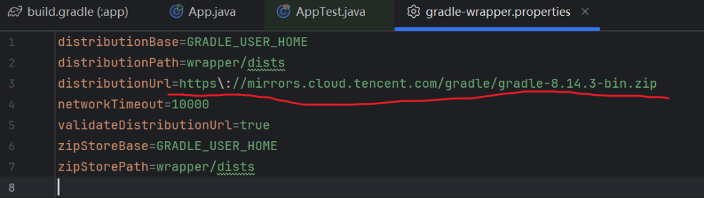 修改后:https://mirrors.cloud.tencent.com/gradle/gradle-8.14.3-bin.zip